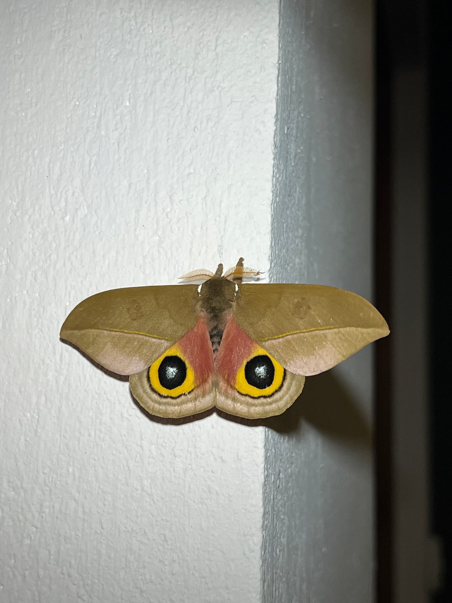 BehaviorPrimarily nocturnal, adults are attracted to light and remain inactive during the day. When threatened, they may suddenly reveal large eyespots on their hindwings to startle predators. Caterpillars cluster together when young and display synchronized defensive behavior.