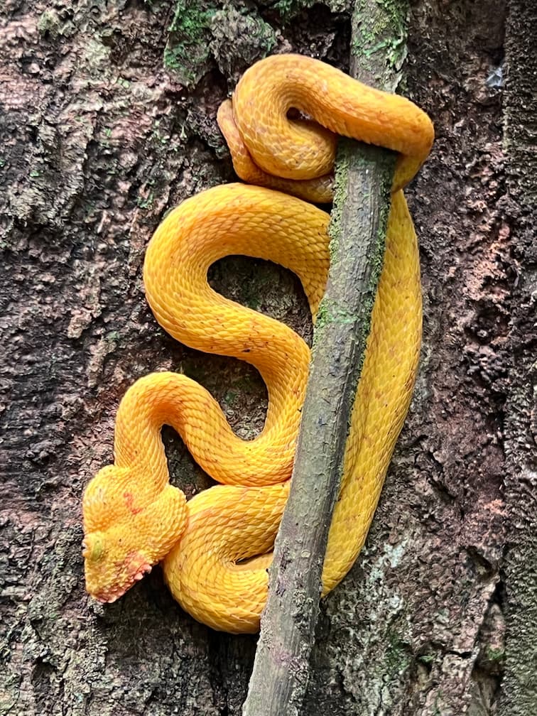 The oropel morph is one of the most photographed snakes in Costa Rica due to its vivid golden color. Despite its bright appearance, it is extremely hard to spot in the wild. The “eyelashes” help break up the snake’s outline, enhancing camouflage.