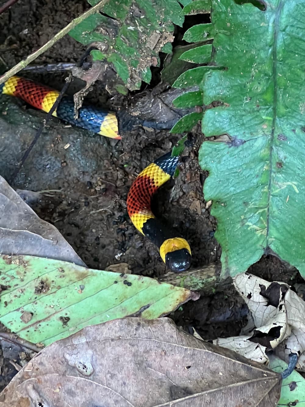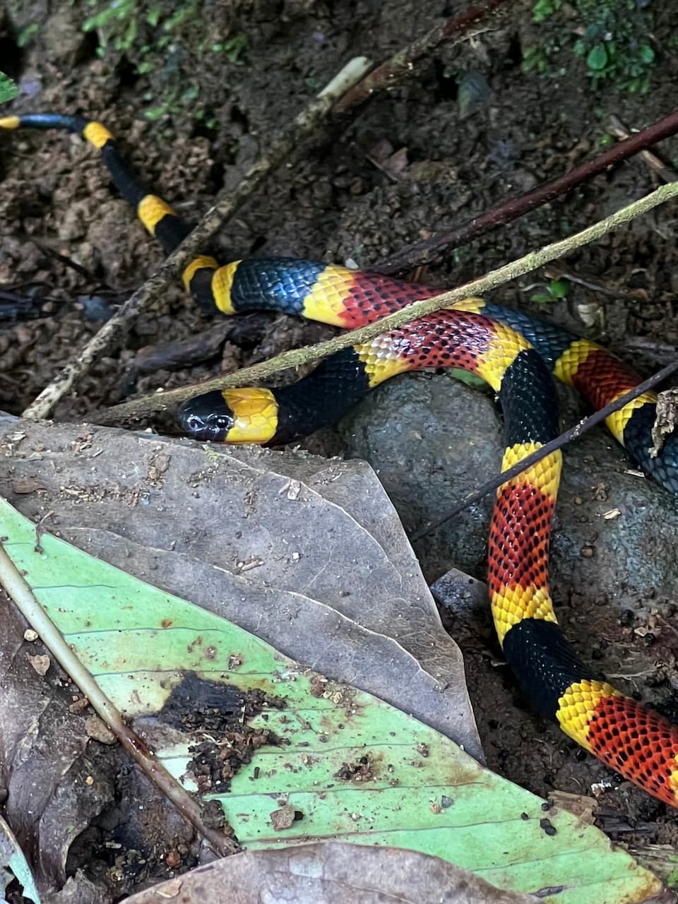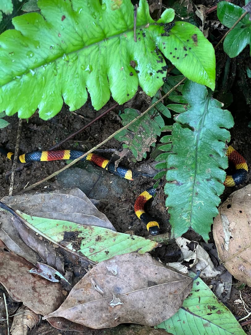 This coral snake is shy and non-aggressive, relying on its warning coloration rather than confrontation.
